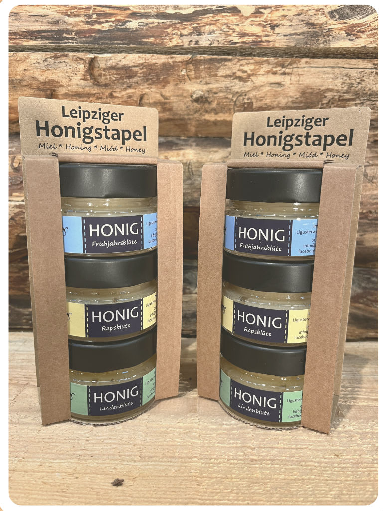 Unser beliebter Honigstapel, bestehend aus drei Gläsern mit jeweils 90g. Perfekt zum verschenken oder für Neugierige zum selbst probieren. Sorten sind variabel und werden nach Verfügbarkeit der Sorten kombiniert.