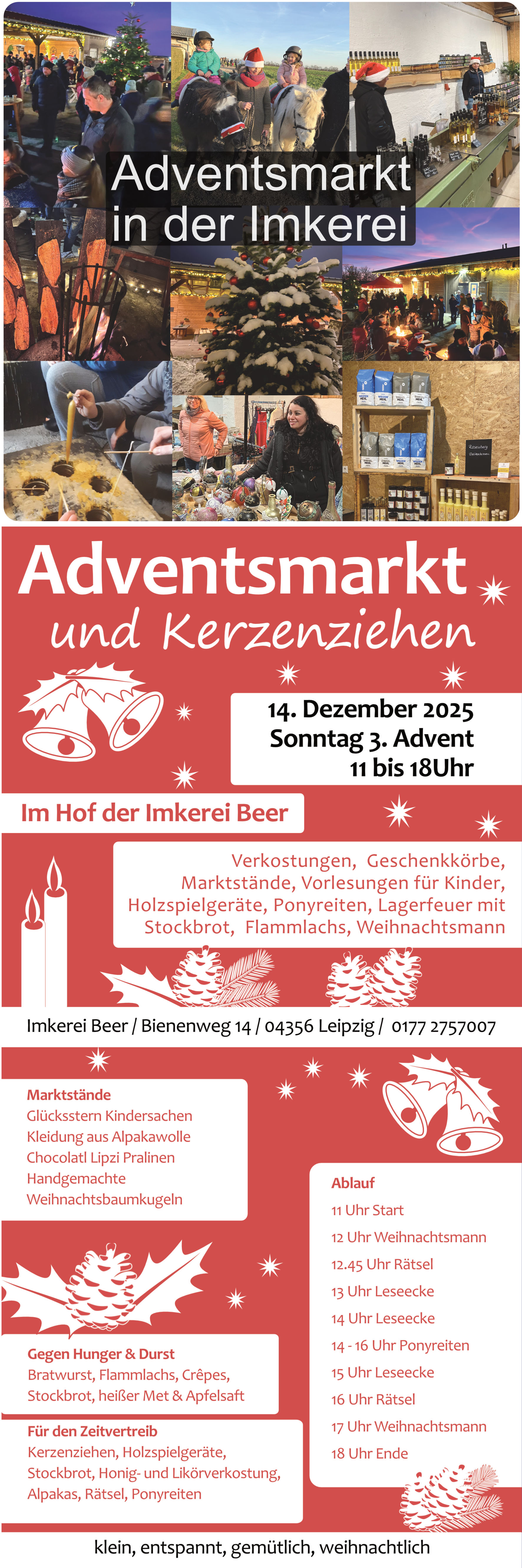 Unseren beliebten Adventsmarkt werden wir wie gewohnt beibehalten und nichts wesentliches verändern. Es bleibt klein, gemütlich und weihnachtlich. Wir freuen uns auf Euch. Liebe Grüße die Imkerfamilie Beer